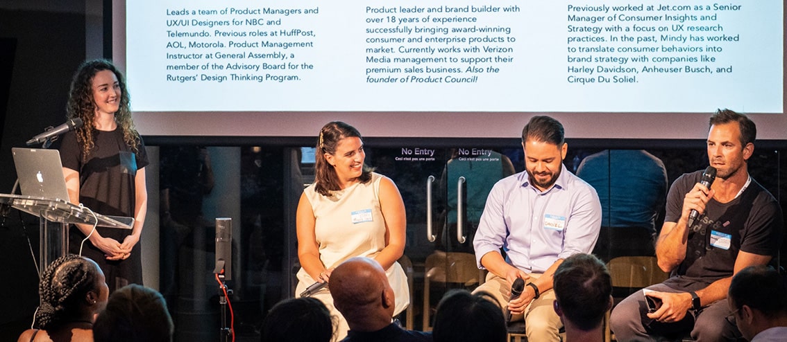 The first presenter shares a product challenge that they are currently facing and gets live feedback from three experienced product experts—our Product Council—as well as our audience.